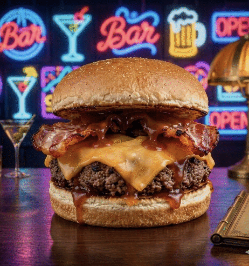 Tocino crocante – Queso Cheddar – Aros de cebolla todo con una leve cobertura de salsa BBQ de la casa o BBQ Hot
